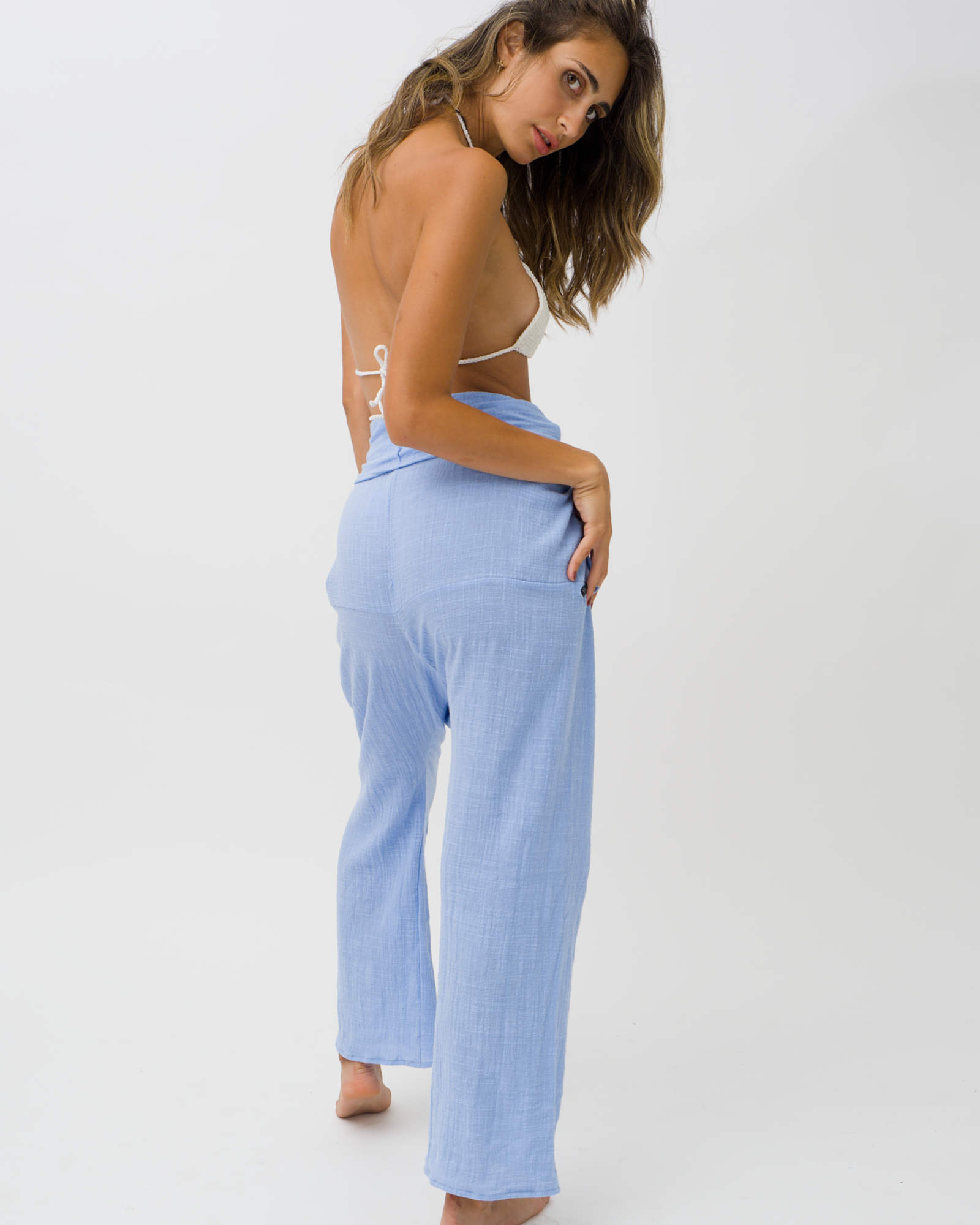 Light, breathable wrap trousers in 100% Italian cotton with a linen-like texture. Handmade in Italy for effortless summer elegance and ease of movement.